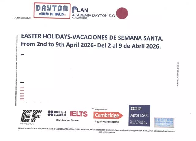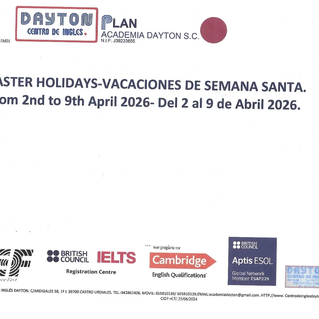 CENTRO DE INGLÉS DAYTON somos una academia de Inglés en Castro Urdiales-CANTABRIA dedicada al enseñanza de Inglés y Español para Extranjeros. Preparamos a nuestro alumnos para exámenes oficiales y también apoyo y refuerzo escolar. Clases online.Traducciones oficiales por un Traductor Jurado nombrado por el Ministerio de Asuntos Exteriores.